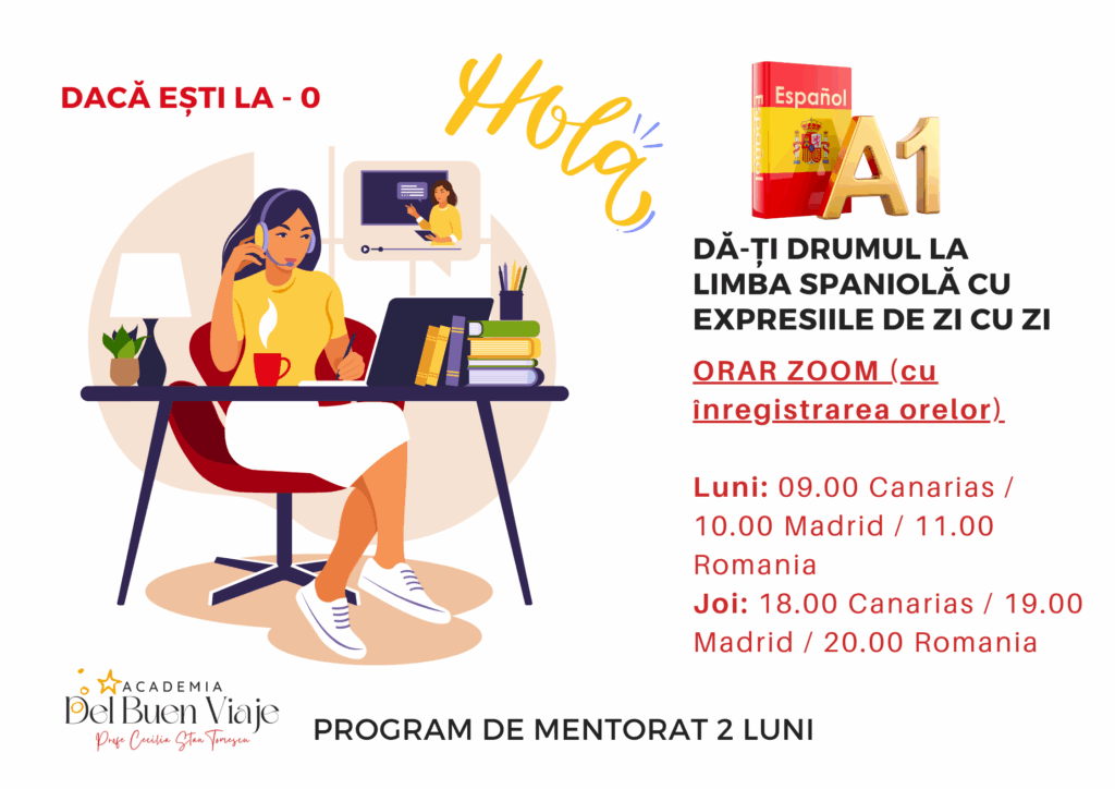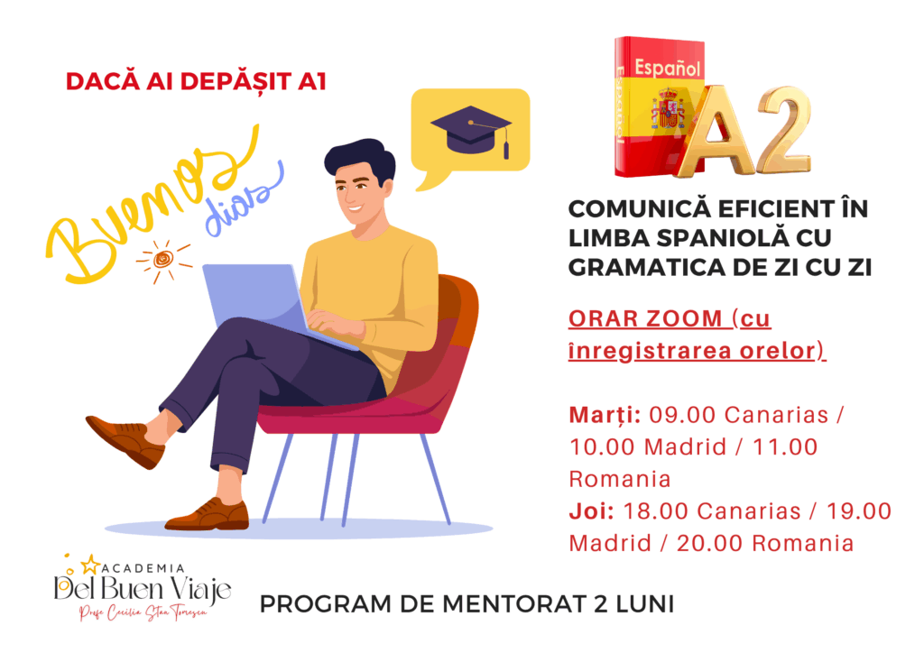 Poți învăța spaniolă de la 0 a nivel conversațional în 6 luni! Hai la o întâlnire de consultanță 1 la 1 pentru a vedea cum funcționează metoda noastră, nivelul de la care pornești la spaniolă și ce curs e cel mai potrivit pentru necesitățile tale, pentru a avansa la limba spaniolă alături de noi, într-un mod logic și structurat.